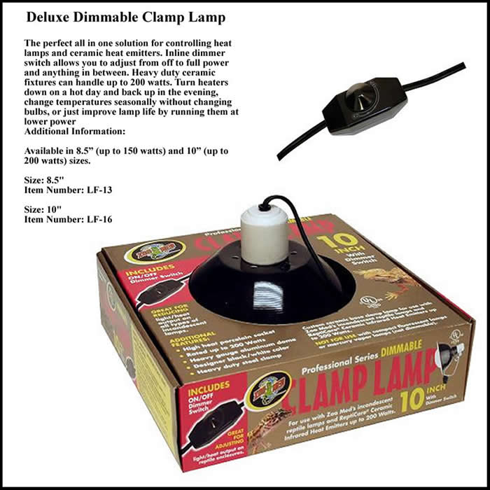 Zoo Meds most popular Clamp Lamp fixture is available in three sizes: 5 1/2"(14cm), 8 1/2"(22cm), or 10"(25cm) diameter domes. Made of heavy gauge painted aluminum, with built in on/off switch. All three models have a ceramic socket, and can be used with the Clamp Lamp Safety Cover to protect your bulbs, animals, and home.
