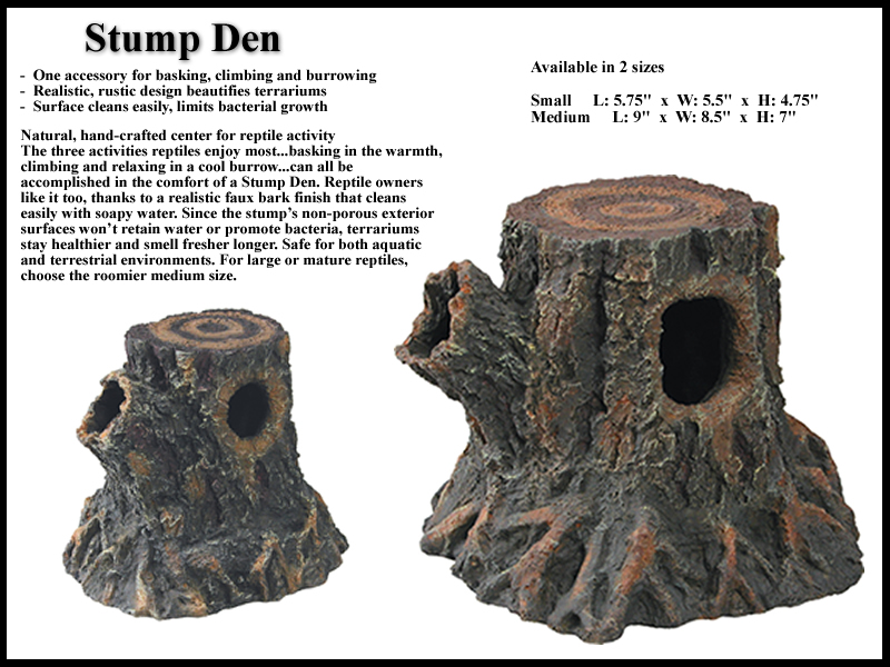 The three activities reptiles enjoy most...basking in the warmth, climbing and relaxing in a cool burrow...can all be accomplished in the comfort of a Stump Den.