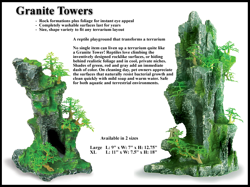 No single item can liven up a terrarium quite like a Granite Cave! Reptiles love climbing the inventively designed rocklike surfaces, or hiding behind realistic foliage and in cool, private niches. Shades of green, red and gray add an immediate dash of color. On cleaning day, pet owners appreciate the surfaces that naturally resist bacterial growth and clean quickly with mild soap and warm water. Safe for both aquatic and terrestrial environments. |